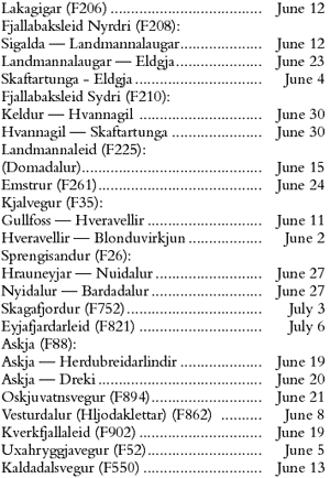 OPENING OF MOUNTAIN TRACKS: Most mountain roads are closed until the end of June, or even longer because of wet and muddy conditions which make them totally impassable. When these roads are opened for traffic many of them can only be negotiated by four-wheel drive vehicles. For some mountain tracks it is strongly advised that two or more cars travel together. Also, before embarking on any journey into the interior collect as much information as possible regarding road conditions from a travel bureau, tourist information office or the Public Roads Administration, Tel.: 1777 (while in Iceland ), daily 8 AM to 4 PM , www.vegagerdin.is.