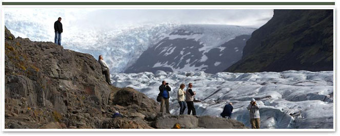 If hiking on a glacier sounds like something you could only experience on television in sweatpants, think again. An Iceland glacier walk is a great way to experience nature and the Sólheimajökull glacier is an ideal way to spend the day. The Eyjafjallajökull massif is only two hours from Reykjavík, and is a safe and easy glacier walk to an ice field where a wonderland of natural ice sculptures, ridges and deep crevasses await your discovery. Just a little further east, the Sólheimajökull glacier tongue extends down from its mother glacier, Mýrdalsjökull, Iceland's fourth largest. On the way back there's a stop at the picturesque waterfalls of Skógafoss and Seljalandsfoss. Experienced mountain guides will teach you how to use the basic ice equipment necessary for this tour.