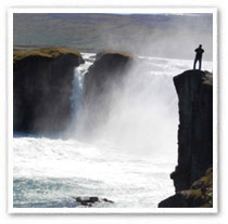 Don’t fence us in …. one thing visitors immediately notice about visiting Iceland’s 10,000 waterfalls is that the scenery is rarely obstructed by fences or other barricades. At Niagra Falls you get the impression authorities would prefer to strap you in with harnesses, what with all the fences and warning signs and whackos going over the falls in barrels. Not Iceland. You can get as close to the edge as you dare, although we don’t advise it. The Godafoss ("Waterfall of the Gods”) waterfall between Akureyri and Myvatn is where we found this particularly brave fellow.