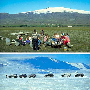 The forces of nature in south Iceland have shaped not only the land but man's life too. In medieval times people thought fiery Mt. Hekla was the gateway to Hell. Off the south coast, the Westmann Islands were evacuated for a couple of months in 1973 because of volcanic activity - but the inhabitants soon went back. Killer whale Keiko also left stardom in the "Free Willy" movies to go back there to his native haunts. Just off the Westmann Islands is Surtsey, a new island which suddenly appeared out of the sea; access is limited to scientists, however.